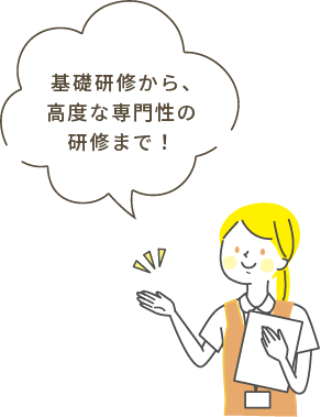 職員としての素地を養う基礎研修から、さらに⾼度な専⾨性の⾼い研修をします。